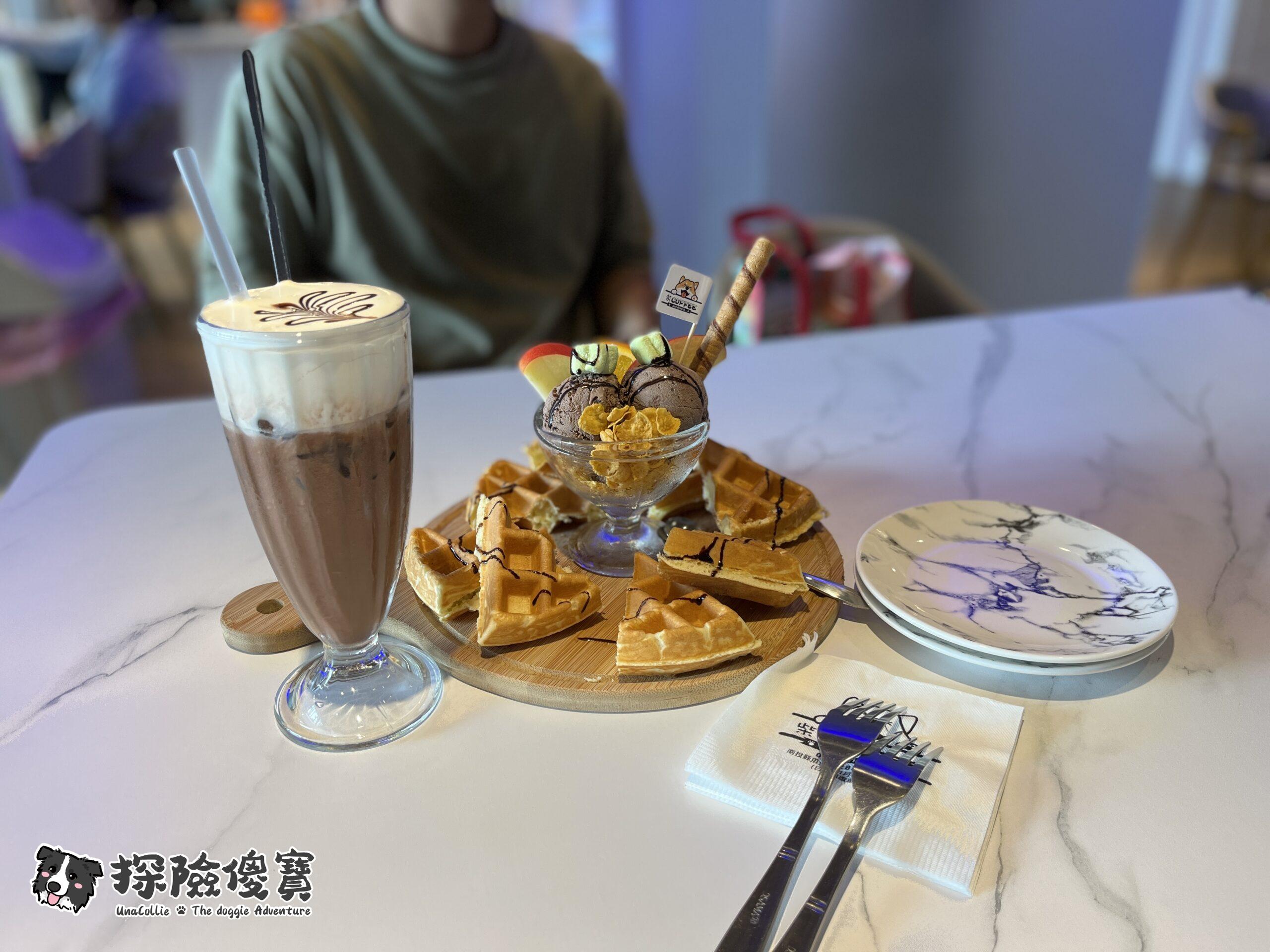 我們點了一份巧克力鬆餅跟一杯巧克力牛奶,